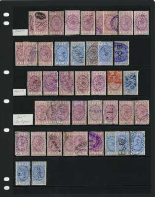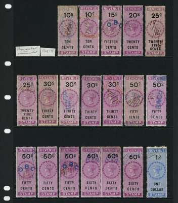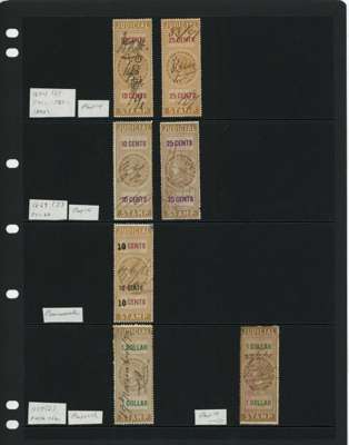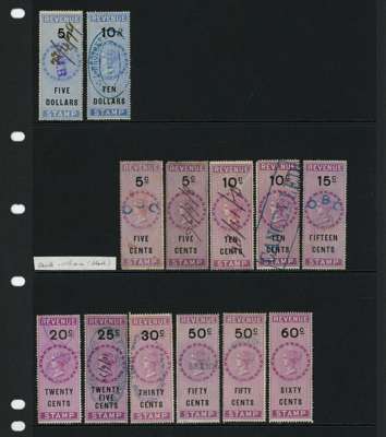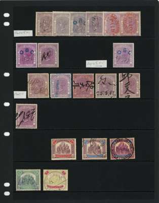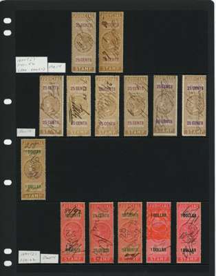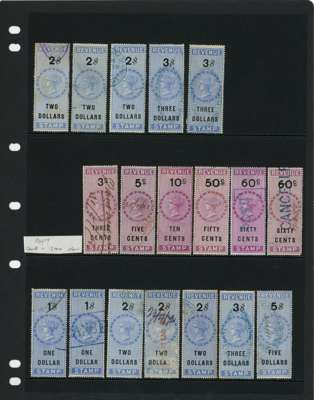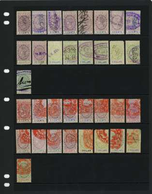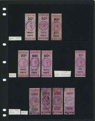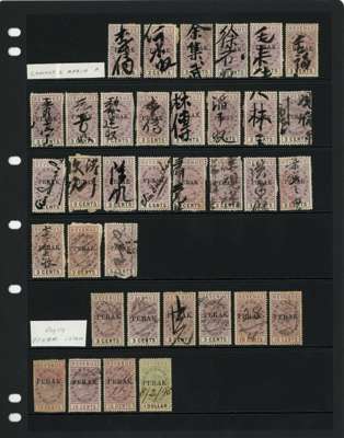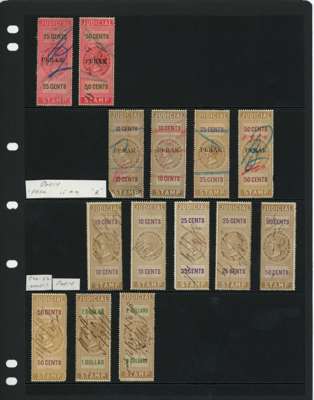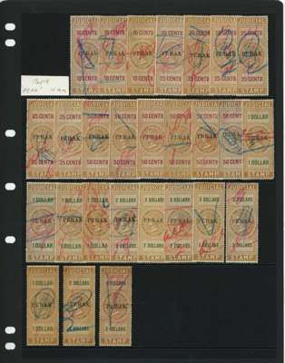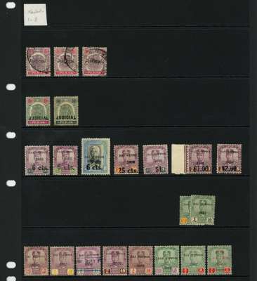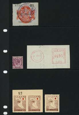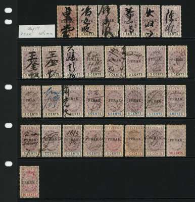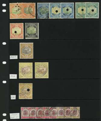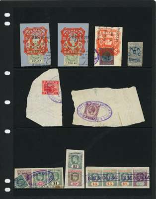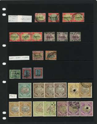 Malaya and States Extensive collection (100s) displayed on stock sheets, with minimal duplication, each set sorted by Perforation, overprint and paper type, starting with Straiits Revenue small format issues to $5, PERAK overprints on Revenue issues and Judicial issues to $3, STRAITS Judicial issues to to $1 including many perforation varieties and 10c on 2c official, strong range of large format REVENUE issues and Foreign Bill values to $3, FMS $100 purple and carmine MINT and $250 purple and blue used (2, one faded), Strong range of Judicials including both overprints and Leaping Tiger issues to $10, and a good general range including HASIL values to $250, Penang and BMA $25 KGVI keyplates, Entertainment tax etc. A great lot for study, with much of great value and interest.