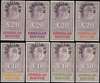 Consular Service: c. 1904 group of eight imperforate colour trials in lilac, printed on thick card, denominated £10 (4) or £20 (4), each overprinted horseshoe 'SPECIMEN' and showing a different trial colour for the appropriation tablet- including the issued red and purple shades. A highly attractive and very rare set.