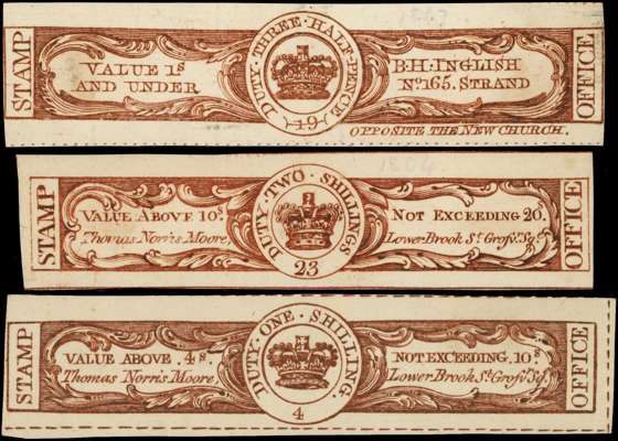 Medicine Duty: 1795-1823 group of 5 different proof impressions paying 1½d, 3d, 6d, 1s and 2s duty including 'BH INGLISH, NO. 165 Strand' a company charmingly listed as being 'OPPOSITE THE NEW CHURCH' referring to St Mary le Strand which was completed in 1724! Fascinating and attractive pieces of social history. Booth types 83a/c, (see p. 339 for detailed listing)