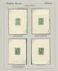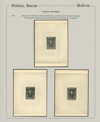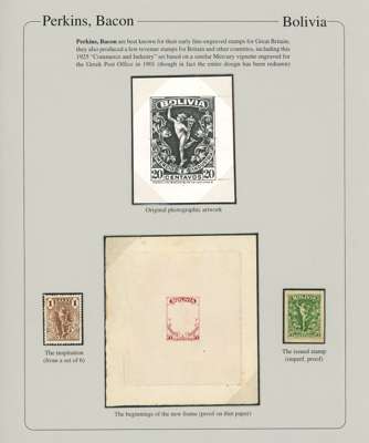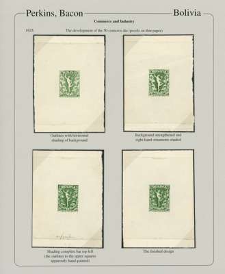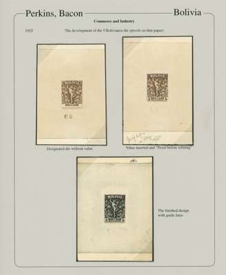 Commerce & Industry: 1925 series of EIGHTEEN progressive working Die proofs, photographic essay, and imperf proof of the issued stamp, on exhibition pages showing the inspiration for the design (a 1901 Greek postage issue), then the proofs progressing from frame only, central engraving being added then proofs in black, followed by the issued colours. A remarkable group which displays beautifully, ex Clive Akerman and offered on his original Exhibition pages