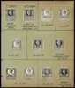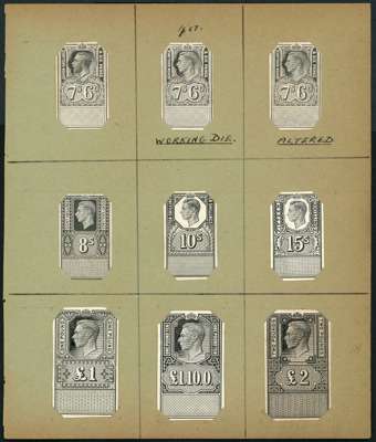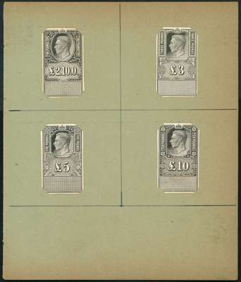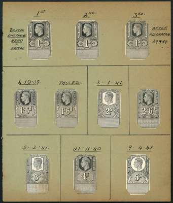 1939 KGVI unappropriated Dies, Four pages from Royal Mint Engraver's book comprising 34 stamp sized die proofs on glazed card denominated 1d to £10, each annotated in black ms, with 1d, 6d, 1s(2), 1s6d, and 7s6d with additional proofs after correction or alteration. A superb and unique archival record from the KGVI period, perfect for display or exhibiting.