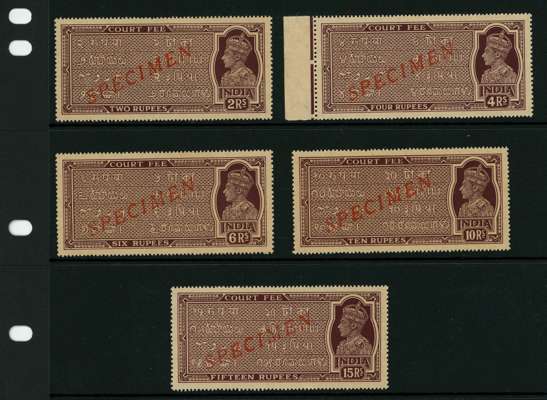 Court Fee: 1937 KGVI 1a to 15r set of 15 each opt 'SPECIMEN' in Italic seriffed red font. Yellowed gum, though a very rare set, this style of opt believed to be applied by Nasik printers
