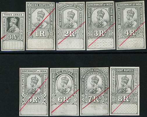 c.1910 KGV Unappropriated Key Type for India, stamp sized DIE PROOFS in black on glazed card (9) comprising 3a and 1r-8r, each with red pen stroke idneitfying their provenance as the De La Rue striking book. A most attractive group.