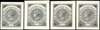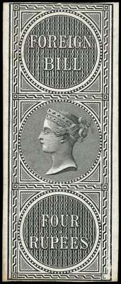 Share Transfer: Group of Four Stamp Sized Die proofs on glazed card, affixed to white card, denominated 6r4a, 7r, 10r, and 20r, offered with 1861 Foreign Bill Die Proof denominated 4r. A few minor blemishes as is usual for proofs of this era, still a fine and intricately designed group.