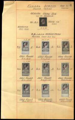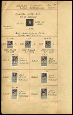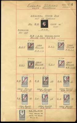 KGVI Unappropriated Dies Revenue. 1939/45 complete set of THIRTY Royal Mint die proofs from 1d-£50 each with manuscript annotations and date of completion for each die. Each complete proof, is handstamped 'CANCELLED' in red. A unique and impressive assembly of the highest importance of the keyplate design which was utilised for issues of Great Britain and Commonwealth for the entirety of the reign. A wonderful opportunity! These pages from the volume presented to the Royal Mint Engraver H.A. Richardson on his retirement.