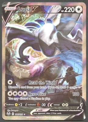 This lot features the much sought after Lugia V special illustration rare from Lost Origin, This card would be considered in poor condition as it has a round surface defect that was found as it was pulled from the pack. The front is in pack fresh condition but the back has significant wear.