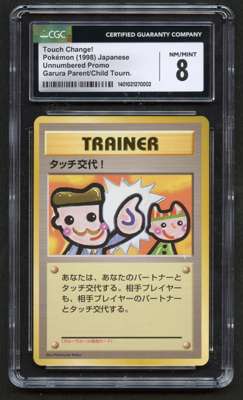 The CGC 8 Touch Change! Garura Parent/Child Tournament Promo is a rare Japanese Pokémon card awarded during the exclusive 1998 tournament. Featuring unique artwork depicting Kangaskhan and its baby, this promotional card is a prized piece of early Pokémon history. With a CGC grade of 8, it is in excellent condition, showing minimal wear while preserving strong aesthetic appeal and collectability.