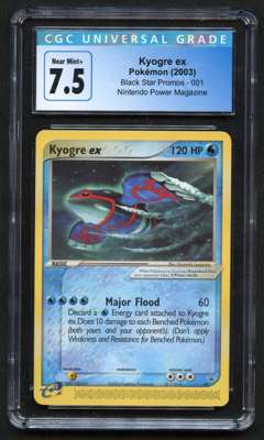 This lot contains a non-holo Kyogre promo from the Nintendo Black Star Promo set. This card has been graded and authenticated by CGC and awarded a NEAR MINT+ 7.5.