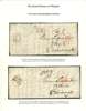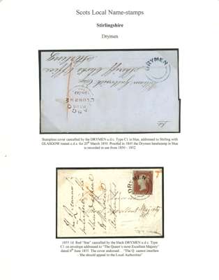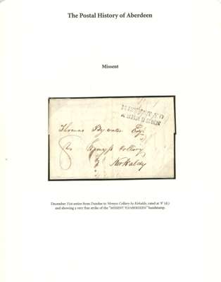 Three covers showing high postal rates: Entire from Dundee to Wemyss Colliery, Kirkaldy, rated '8' and showing fine strike of "MISSENT TO/ABERDEEN" in black. 1799 June 30th entire Glasgow to Edinburgh, endorsed '2¼oz' and charged 3s, bearing circular framed "GLAS/GOW" townstamp and Edinburgh Bishopmark. 1799 November 9th Glasgow to Edinburgh, endorsed '1¾oz' and charged 2s.11d, bearing circular framed "GLAS/GOW" townstamp and Edinburgh "NO/10" Bishopmark. Plus, stampless cover cancelled by the 'DRYMEN' u.d.c. Type C1 in blue, addressed to Stirling with Glasgow transit cds "20 MR/1850". The Drymen handstamp in blue only recorded in use from 1850-52, and 1855 1d red 'star' tied by the Drymen u.d.c. Type C1 addressed to "The Queen's most Excellent Majesty" with the cover endorsed "The Q. cannot interfere - She should appeal to the Local Authorities."