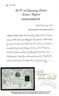 1840 1d black Mulready letter sheet, stereo A54, forme 3, uprated with 1840 1d black plate 2 (AF), to pay postage up to one ounce, sent Torquay to Whitchurch via London, sheet and adhesive cancelled with black MC and l/l Torquay cds 'DE 30/1841'. Good BPA certificate (2001) states " adhesive removed, treated to reduce staining and replaced". Some ageing still attractive. SG ME1/Spec. ME1g