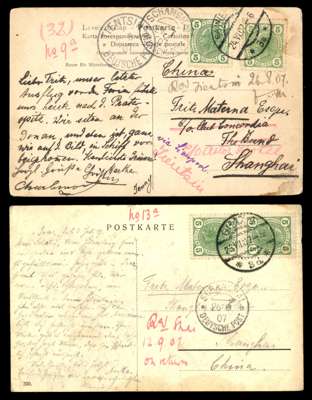 Group of four cards from Austria, all to Shanghai, 1906 card via German Post Office with bilingual Shanghai arrival, 1907 card via Napoli, German Post Offices and Local Post arrival, card from Vienna via Tientsin and Schanghai German Post Offices and card from Graz with Schanghai Deutsche Post cds.