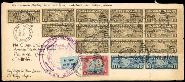 China 1929 cover carried on the New York to Tokyo L.Z. 127 Graf Zeppelin franked with 10c (2, one rounded corner), 15c (12) and 1928 5c carmine and blue all tied by Phila.PA. North Phila. Sta. duplex, large violet First Round-The-World Flight cachet, reverse with two Peping arrival cancels; a vertical filing fold, a scarce Chinese acceptance