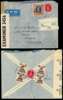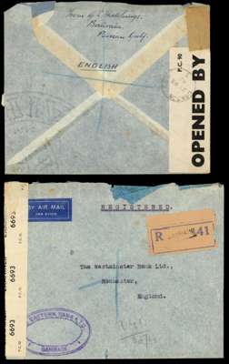 Two censored airmail covers, both registered, with 1942 to Rochester franked 1a and 1r tied two double-ring cds, top marginal white registration label also tied below, also a 1944 cover with a manilla-coloured registration franked on back with mixed issue franking at 17a rate; both a little roughly opened at top