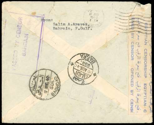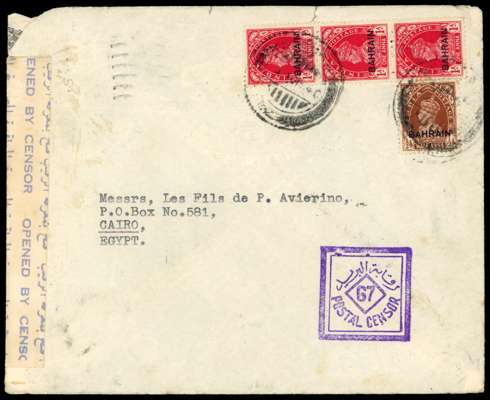 1940 envelope to Cairo with ½a and strip of three 1a, Bahrain CDSs of 4 AUG. Boxed purple censor on front, and sealing tape at left. On reverse, Basra and Baghdad transits, and boxed violet Bahrain censor. A bit tatty but a nice commercial cover
