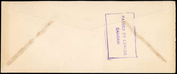 1938-41 3a6p bright blue sole franking on cover (9½ x 4") to San Francisco, slightly unclear CDS (4 MAY 41?), violet boxed Bahrain censor on reverse. Unusual. SG 27