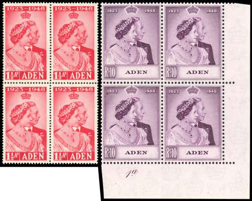 1948 Silver Wedding pair in unmounted o.g. blocks of four, the 10r a corner block with Plate 1a. SG 30-1, £163