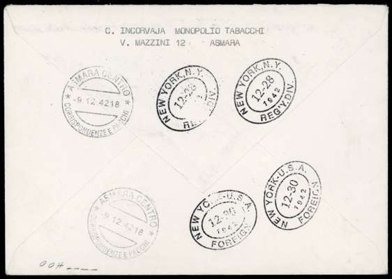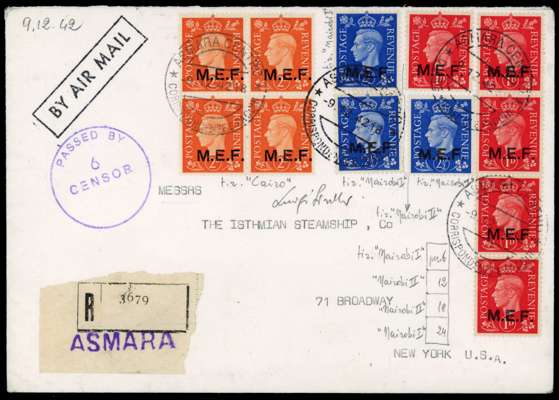 1942 registered envelope to New York bearing Nairobi 2d block of four, plus Cairo 1d square stops single, 1d vertical strip of four with the upper and lower stamps with round stops, 2½d round stops x 3. ASMARA CENTRO/ CORRISPONDENZE E PACCHI datestamps of 9.12.42, violet PASSED BY CENSOR 6. Franking of 1/8½d is 3½d underpaid. Ex Spink sale #23117 (Lot 3315) and with 2005 Sirotti Certificate as genuine. However, the cancellations are faked. Offered with Mike Sanders opinion (taken from email and unsigned). SG M2, 6, 6b, 8a