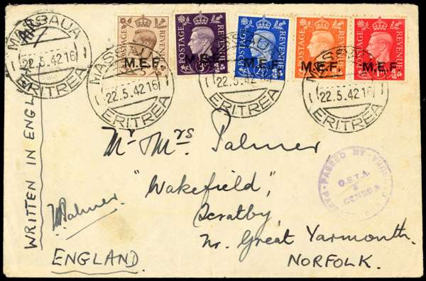 1942 envelope to Norfolk with set of five Nairobi overprints, the 2d with square stops, the others round, used with Massaua CDSs of 22.5. OETA Censor 5 on front. Light staining affects the top perfs of some of the stamps (not the 5d), otherwise fine. SG M6a, 7, 8a-10a, £427 as stamps