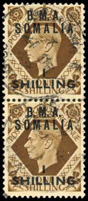 1948 BMA 1s on 1/-vertical pair, the upper stamp with Cyl. 6 dot R7/12 broken barb, fine used. SG S18 var, CW 18a (£120)