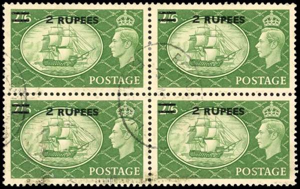 1955 2r on 2/6d surcharge Type II, block of four with light REGISTERED/BAHRAIN cancel. Lower pair a trifle grubby, and a few perfs a little short; unusual cross-usage and a scarce multiple. SG 41a, £260