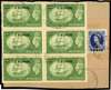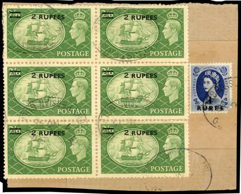 1955 2r on 2/6d yellow-green surcharge Type II block of six, on piece with oval Doha registered cancels of 7 NOV 55. Believed to be the largest known multiple of this stamp used in Qatar - Donaldson notes it is ‘very scarce’ used thus. SG 41a, £390