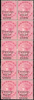1885 28c on 48c rose local surcharge as type 23, block of ten (2 x 5), the surcharges from positions 1-2 of the setting, fresh o.g. (stamps unmounted but with minor adhesions/ offsets). Odd shortish perfs and the upper left stamp with trivial wrinkle, still a lovely and scarce multiple. SG 168