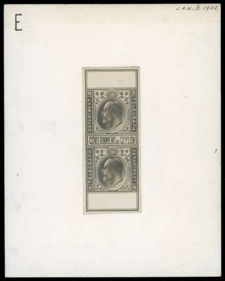 Telegraphs. 1902 KEVII type 131 design, undenominated stamp-sized photographic essay affixed to card, (90 x 112mm) lettered ‘E’ at upper left and dated ‘Jan. 3. 1902.’ at upper right, very fine and rare, an important item. Ex De La Rue Archives. For SG T150-64