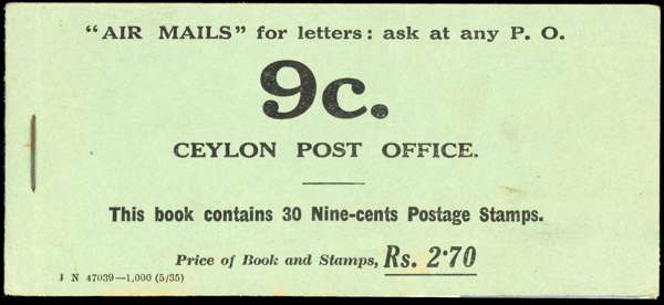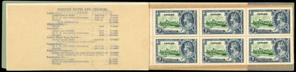 Booklets. 1935 (May) 2r70 Silver Jubilee booklet, black on light green cover, containing 30 x 9c green and indigo in panes of 6 (3x2), the first pane exceptionally showing the constant variety 'Diagonal line by turret' (Vignette plate '2A', R10/1-2) on the first and second stamps in the lower row. Really fine condition for this rare booklet (first two panes with faintly toned gum) and the first we have seen including the varieties (= SG 380f). The May printing was of 1000 booklets only, with a very low survival rate. SG SB12, £1800 without the varieties