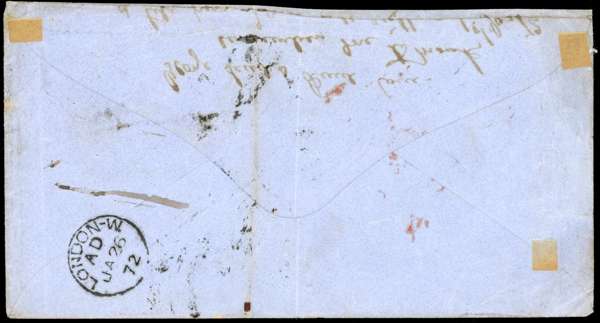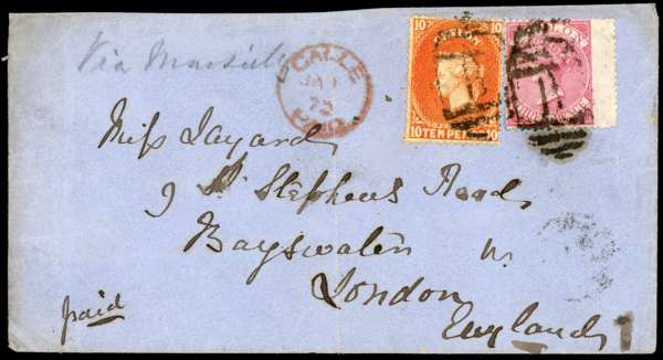 1872 (JA 1) blue envelope to London franked 1866-68 perf 14 3c carmine-rose together with 10d orange, tied by two obliterators, red Galle Paid cds to left, arrival backstamp; a sound example
