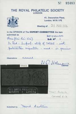 Wei Hai Wei 1898 2c black/scarlet in horizontal strip of three each with the central handstamp and manuscript values and CP in corners, reverse with a complete G. Fergusson signature on reverse, RPSL Cert (1976)
