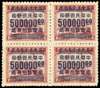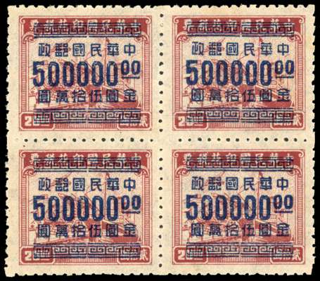 1949 Hankow Gold Yuan surcharges on ‘Transport’ revenue stamps, $500,000 on $20 red-brown in block of four, unused, few nibbled perfs at foot, otherwise fine, a scarce multiple. SG 1191; Chan G125