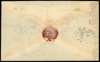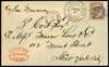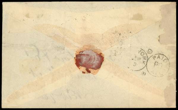 Japanese Post Offices 1881 envelope to New York showing red handstamp of Coit & Co/ NINGPO/ China handstamp franked Japan 1876-86 5s brown with faults, tied by a clear cork cancel that shows stamp damage which occurred before application, I.J.POSTAL AGENCY. SHANGHAI. Aug 3 date stamp alongside, Yokohama transit (Aug 12), the envelope endorsed “Via San Francisco”, arrival backstamp of Sep 3, filing creases, clean condition.