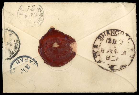 1897 (12 JUL) cover to New Westminster, British Columbia from Shanghai where local postage was paid in cash with dollar chops front and back, 10s Japan adhesive added for overseas postage and tied by Shanghai I.J.P.O. cds, reverse with Japanese transit showing inverted dates, part San Francisco transit and arrival cds; envelope slightly reduced at left side