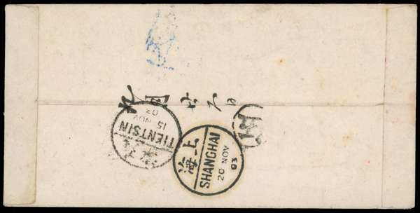 1903 red illustrated native envelope from Tientsin to Shanghai bearing single franking 1c Coiling Dragon tied by blue boxed chop, reverse with Tientsin (15 Nov) and Shanghai cds (20 Nov)