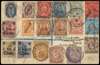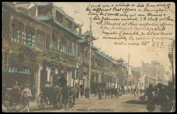 1906 picture postcard of Nanking Road, Shanghai to England franked 5c Coiling Dragon plus French Post Offices 5c and 10c, German Post Offices 1c, 4c and 10c, Japanese Offices 1s and 5s, Russian Offices 1k and 5k, USA 2c, 4c, 5c and 10c and Hong Kong 1c, 4c (cut into at top) and 10c, certainly colourful.