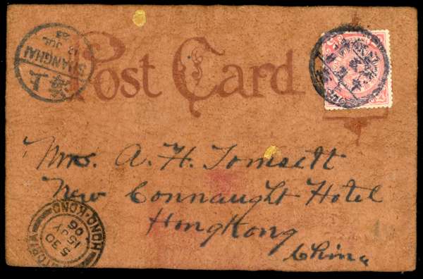 1906 American-style leather postcard depicting an owl, franked 5c Coiling Dragon tied by native datestamp, bilingual Shanghai cds at left and below this the Victoria Hong Kong arrival cancel, extremely scarce type of card used from China