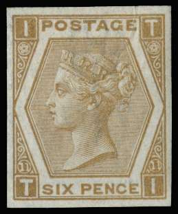 1872 6d Chestnut Pl.11. Very fine unused o.g. imperforate imprimatur lettered TI. Very scarce one of only 25 possible examples many of which are in institutional collections. SG 122var