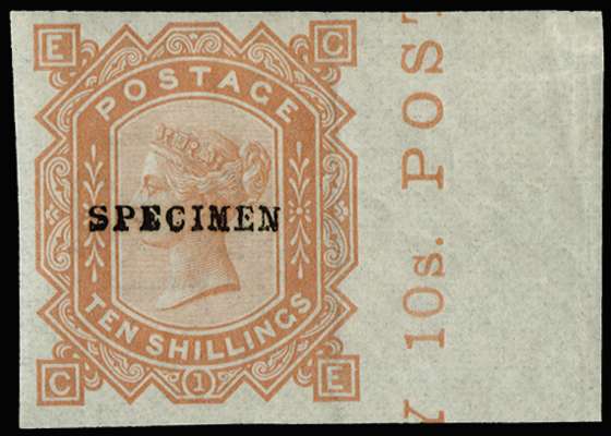 1878 10s Colour trial Pl.1. Very fine imperforate right hand marginal example lettered CE printed on gummed watermarked paper in orange, overprinted "SPECIMEN" type 9. Scarce. SG 128var