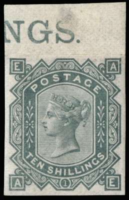 1878 10s Greenish grey Pl.1. Very fine and fresh unused o.g. imperforate top marginal imprimatur lettered AE, showing part sheet inscription. Very rare, one of only 24 possible examples many of which are in intitutional collections, very few marginal examples available to collectors. SG 128var