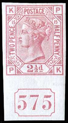 1879 2½d Rosy-mauve Pl.15. Very fine and fresh unused o.g. imperforate top marginal imprimatur lettered PK showing current number "575". A magnificent and unique positional example, the other current number example AB remains on the imprimatur sheet in the Postal Museum archives. SG 141var