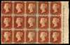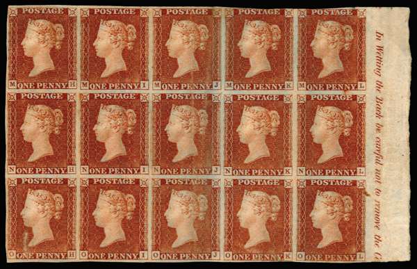 1841 1d Red brown Pl.8. Very fine unused o.g. right hand marginal block of fifteen lettered MH-OL showing part sheet inscription, MI showing double letter "M" variety. A couple light gum creases, minute pin holes affecting NI & OH and just shaved at top of MK & ML nevertheless a magnificent exhibition piece showing dramatic uneven blueing, this block is the largest known unused multiple of this plate in either black of red, the next recorded multiple in red is a horizontal pair. Spec. AS47b, £165,000 as singles. Ex. "Maximus" and "Verus".