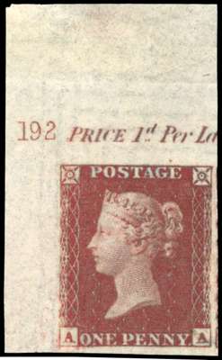 1854 1d red brown Plate 192 (AA), superb unused top left corner marginal imperforate imprimatur showing part sheet inscription and plate number “192”. Rare and attractive. SG 17var