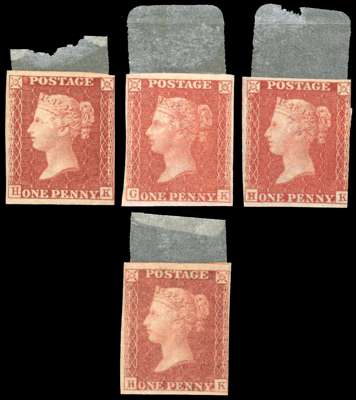 1856 1d red-brown Plate 53 (HK), Plate 55 (GK), Plate 57 (HK), Plate 59 (HK) group of imperforate imprimaturs, Plate 53 and 57 with light creases, and the latter just cut in at right, the rest with four good to large margins and traces of o.g., fine and very rare. (4) Spec. C8var, £2,550.