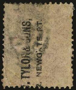 1868 1d Rose-red Pl.134. Very fine used example showing the very scarce 'J. TYLOR & SONS, 2 NEWGATE ST' unofficial underprint in black on reverse reading upwards. Spec. PP294.