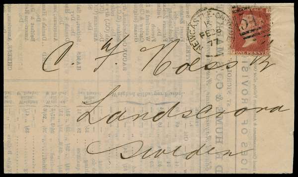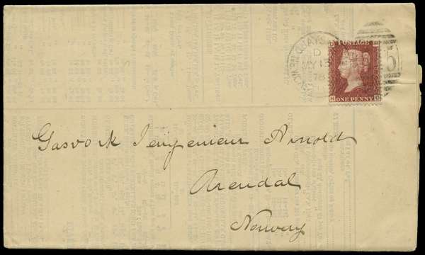 1877-78 pair of entires paying the printed matter rate, the first an entire to Landscrona, Sweden, franked by 1d rose-red Pl. 177 and tied by Newcastle-On-Tyne '545' Duplex for FE 28 77, the second, an entire to Arendal, Norway franked by 1d rose red Pl. 184 and tied by Quayside/Newcastle-on-Tyne '545' duplex for MY 13 78. A lovely pair and scarce in this fine condition.