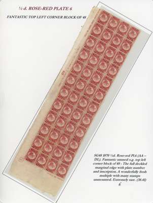 1870 ½d rose-red Plate 6 (AA-DL) top left marginal block of forty eight (!), showing full deckled edge and plate number and marginal inscriptions, brilliant o.g. trivial tones, still an impressive and attractive multiple, with majority of stamps unmounted. Scarce. SG 48 £5700+