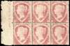 1870-74 rose-red marginal block of six, Plate 1 (OA/PC) with error of lettering OP-PC for CP-PC, large part o.g., with the appearance slightly faded other small faults and minor perf separation. Still a collectable positional example of this rare error. SG 53, £20,000+