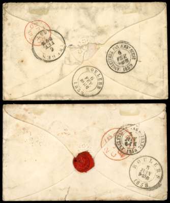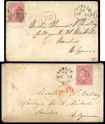 1858-59 four envelopes addressed to Belgium all bearing 4d rose-carmine and postmarked with Dublin duplexes and relevant transit and arrival cancels. Fair. (4)