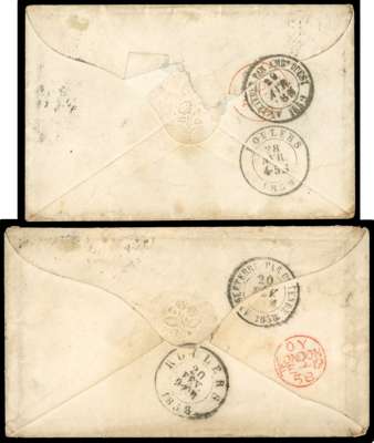 1858-59 four envelopes addressed to Belgium all bearing 4d rose-carmine and postmarked with Dublin duplexes
