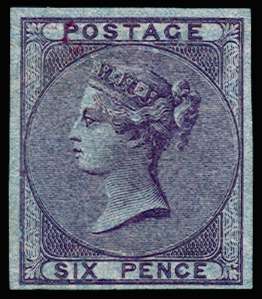 1856 6d Deep lilac Pl.1. (Wmk. Inverted). Very fine unused imperforate imprimatur. Very rare, one of only 24 possible examples, many of which are in institutional collections. Ex "Verus". SG 69var, £7,500.